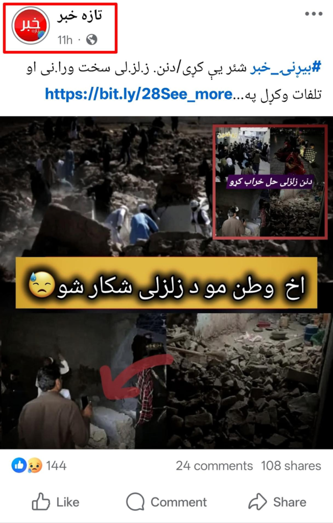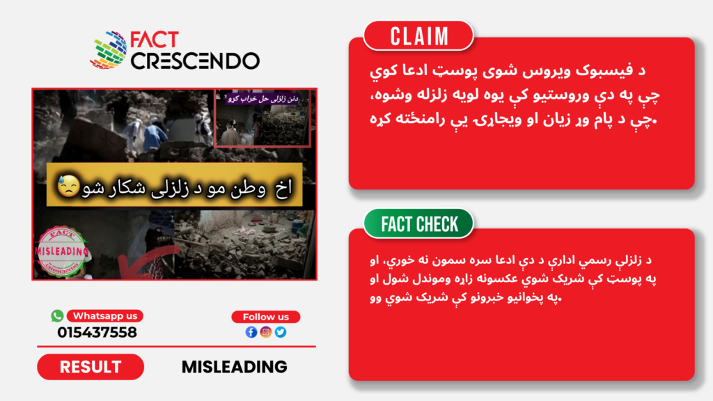 په فیسبوک کې په پښتو ژبه لیکل شوی یو پوسټ په پراخه کچه خپریږي، چې ادعا کوي “نن شپه” په هیواد کې یوې قوي زلزلې ولړزاوه او د پام وړ ویجاړتیا یې رامینځته کړه. په پوسټ کې د نړیدلو ودانیو او د ژغورنې صحنو ډراماتیک انځورونه شامل دي، چې د ټولنیزو رسنیو کاروونکو ترمنځ ویره رامینځته کوي.