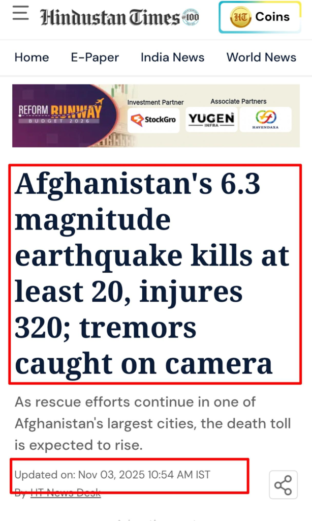 موږ دا هم وموندله چې ورته انځور (یا ورته انځورونه) د هندوستان ټایمز په یوه راپور کې چې د ۲۰۲۵ کال د نومبر په ۳مه خپور شو، خپور شو، چې د رسمي سرچینو او عیني شاهدانو د فوٹیج له مخې، په شمالي افغانستان کې د ۶.۳ درجې زلزلې پوښښ یې کاوه چې په پایله کې یې مرګ ژوبله او ټپیان رامنځته شول. دا تاییدوي چې په ویروسي پوسټ کې خپریدونکی انځور وروستی نه دی او د پخوانۍ پیښې څخه بیا کارول شوی، چې نور هم ښیي چې د فیسبوک ادعا ګمراه کوونکې ده.