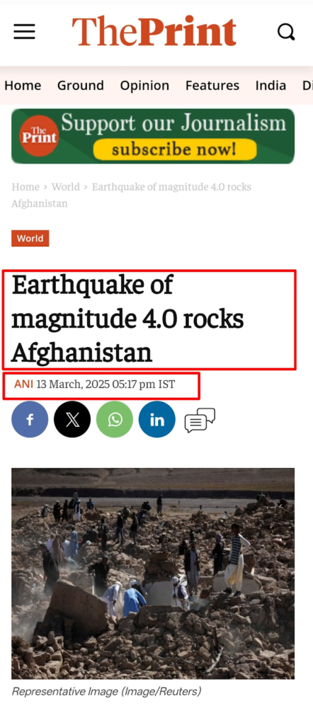 د نورو څېړنو لپاره، موږ د ویروس په پوسټ کې شریک شوي لومړي عکس په ګوګل کې د ریورس عکس لټون ترسره کړ. پایلو وښودله چې ورته عکس دمخه د ۲۰۲۶ کال د فبروري په ۲مه د ThePrint لخوا په افغانستان کې د زلزلې د فعالیتونو په اړه په خپاره شوي راپور کې څرګند شوی و. دا عکس رویټرز ته اعتبار ورکړل شوی و او په هغه راپور کې د استازي عکس په توګه کارول شوی و. دا په ګوته کوي چې دا عکس وروستی نه دی او د ویروس ادعا ملاتړ لپاره په غلط شرایطو کې بیا کارول شوی دی.