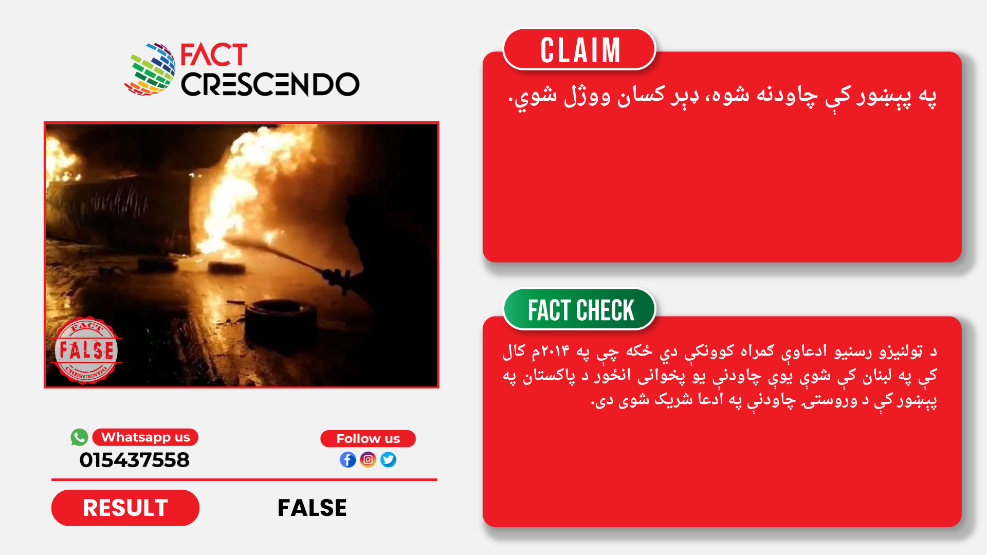 د ټولنیزو رسنیو (فیسبوک) ځینو کاروونکو یو پخوانی انځور له دې درواغ ادعا شریک کړی چې ګواکې په پیښور کې یوه مرګونې چاودنه شوې چې سلګونه کسان یې وژلي.