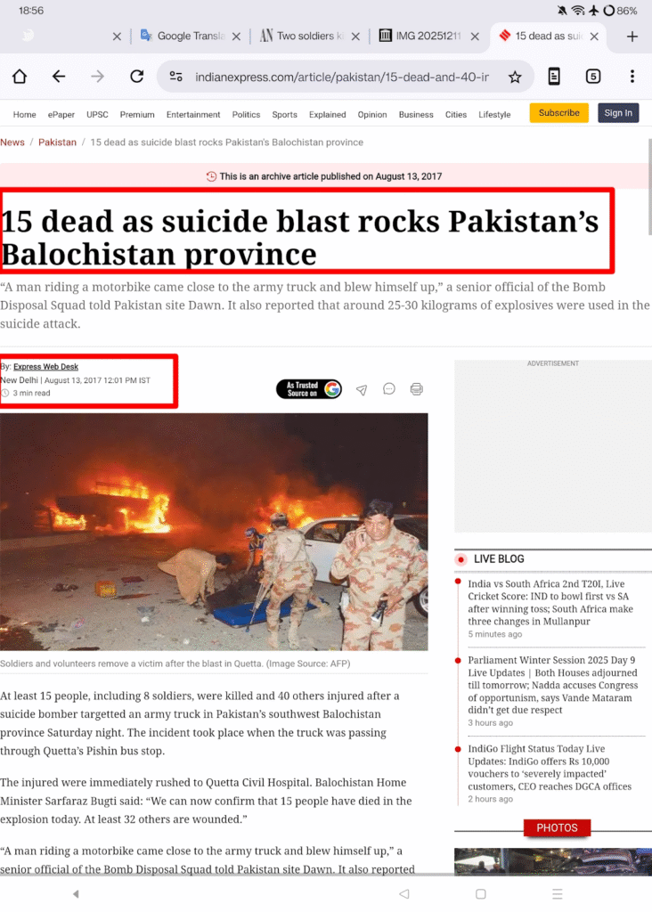 دا انځور د انډین ایکسپریس لخوا د ۲۰۱۷ کال په اپریل کې شریک شو او د خبر مقالې له مخې، د پاکستان په جنوب لویدیځ بلوچستان ایالت کې د پوځ په یوه لارۍ د ځانمرګي برید له امله لږ تر لږه ۱۵ کسان ووژل شول، چې ۸ سرتیري هم پکې شامل وو او ۴۰ نور ټپیان شول.