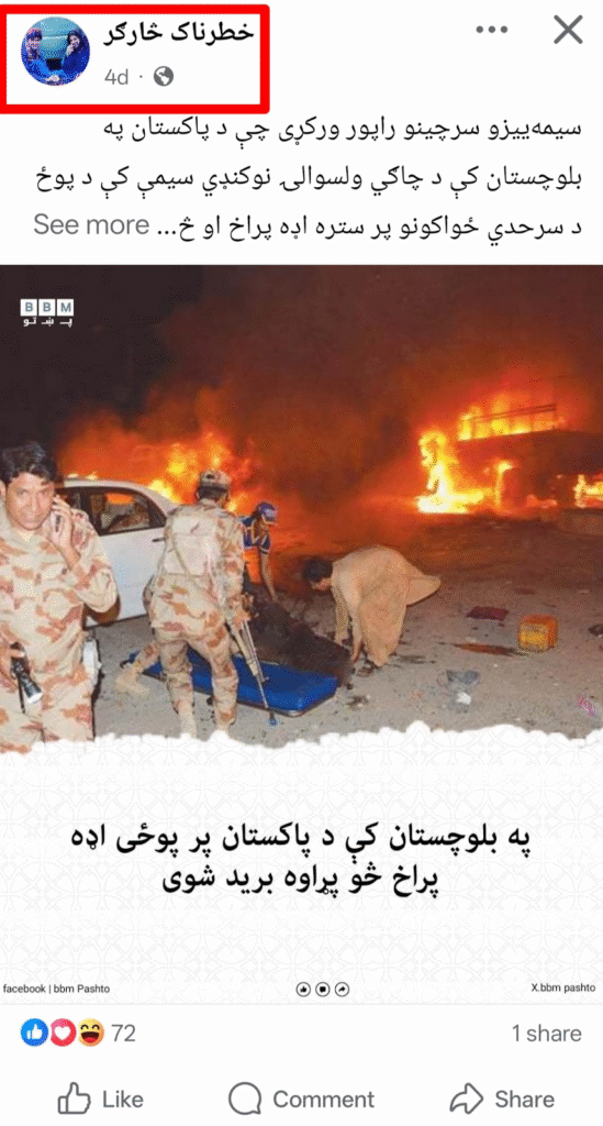 ټولنیزو رسنیو فېسبوک پوسټ ادعا کوي “سیمهییزو سرچینو راپور ورکړی چې د پاکستان په بلوچستان کې د چاګي ولسوالۍ نوکنډي سیمې کې د پوځ د سرحدي ځواکونو پر ستره اډه پراخ او څو پړاوه برید شوی دی. برید د یوه واسکټي چاوېدنې له لارې په دروازه کې پیل شوی او وروسته نور وسلهوال اډې ته ننوتلي او له ځواکونو سره یې سختې نښتې کړي دي.”