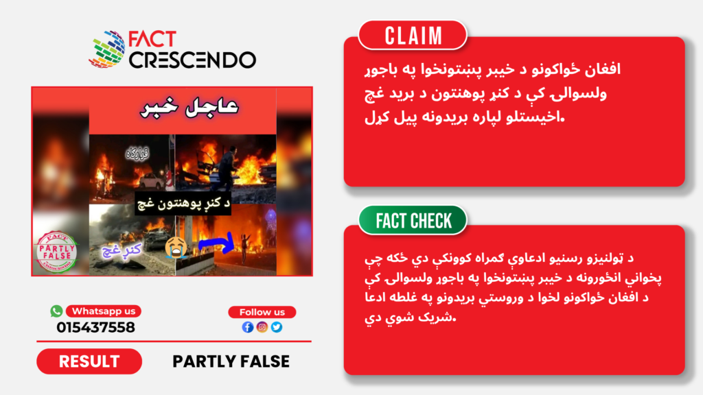 په هرصورت، د فیکټ کریسینډو موندنې ښیي چې د ټولنیزو رسنیو ادعاوې ګمراه کوونکې دي ځکه چې پخواني انځورونه د خیبر پښتونخوا په باجوړ ولسوالۍ کې د افغان ځواکونو لخوا د وروستي برید په توګه په غلط ډول شریک شوي دي.