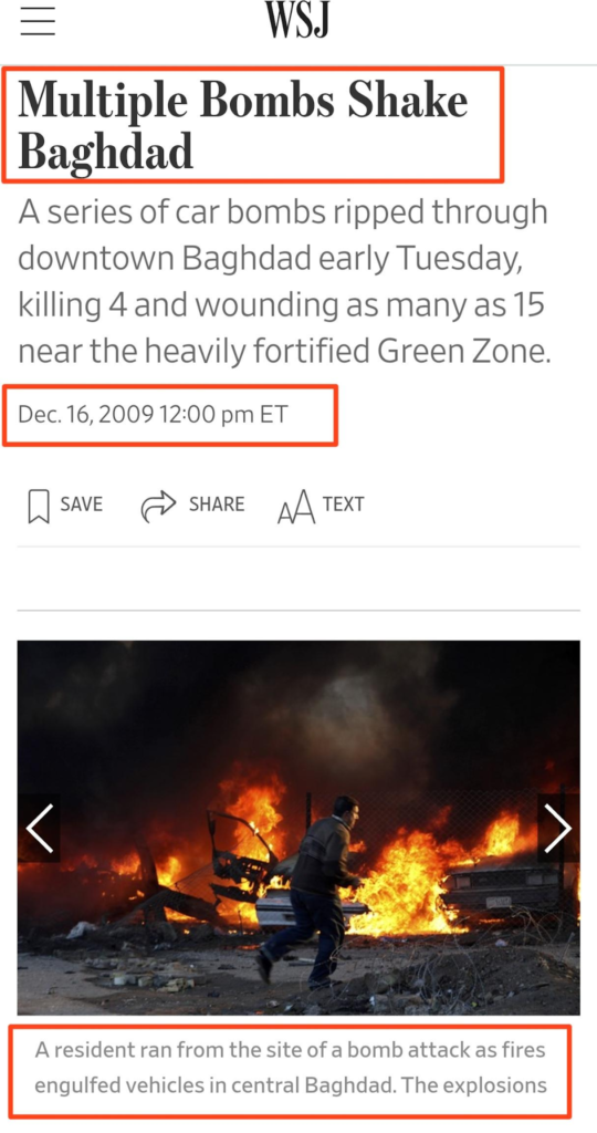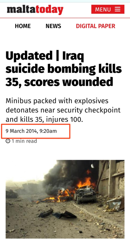 د لومړي انځور په اړه د ګوګل ریورس انځور لټون په کارولو سره، موږ وموندله چې شریک شوی انځور زوړ دی او د ۲۰۱۴ کال د مارچ په میاشت کې په یوه خبر مقاله کې خپور شوی و. د خپرې شوې مقالې له مخې، دا انځور هغه وخت اخیستل شوی و کله چې په عراق کې په یوه ځان وژونکې بمبارۍ کې له ۲۳ څخه ډیر کسان ووژل شول.