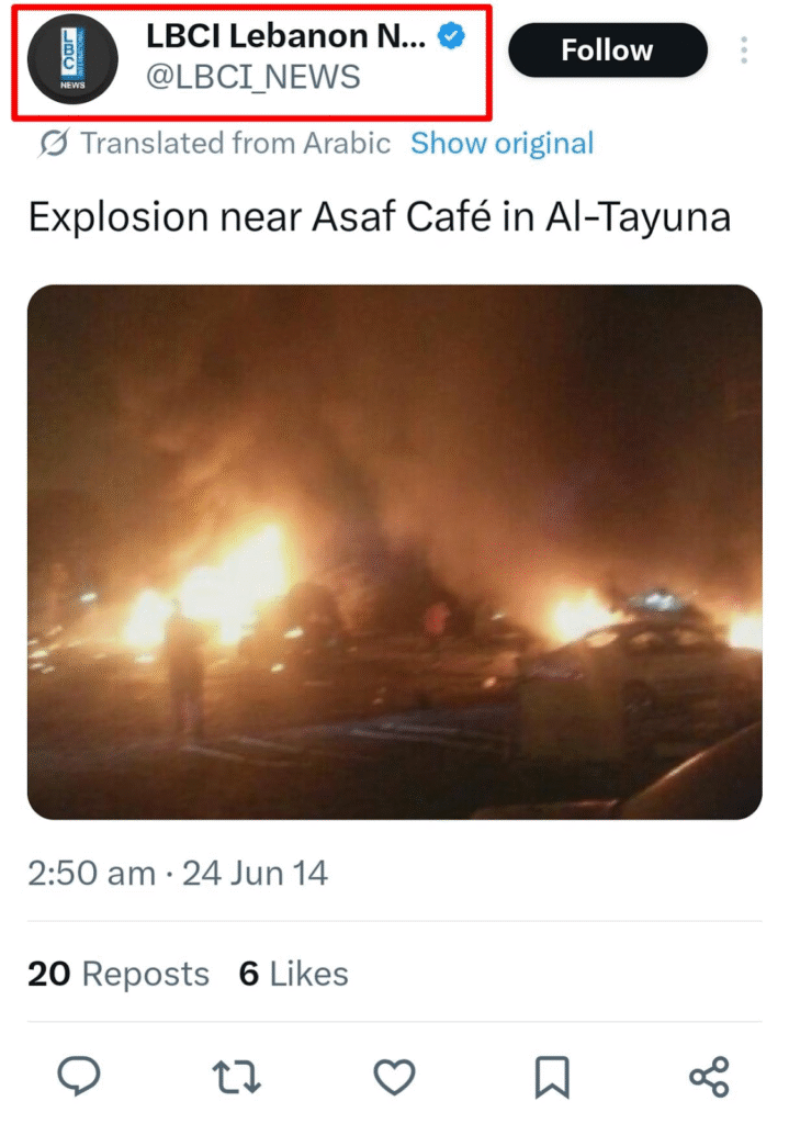 د شریک شوي لومړی انځور په اړه د ګوګل ریورس عکس لټون په کارولو سره موږ وموندله چې شریک شوی عکس څو کاله زوړ دی. ورته عکس د IBCI لبنان نیوز رسمي x (رسمي ټویټر) پاڼې لخوا د ۲۰۲۴م کال د جون په ۲۴مه نېټه شریک شوی و. د پوسټ له مخې، عکس د لبنان په طیونح ښار کې د عساف کیفې ته نږدې د چاودنې سره تړاو درلود.