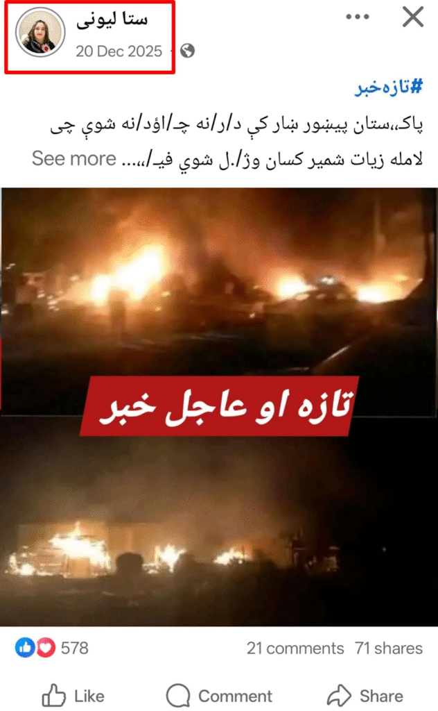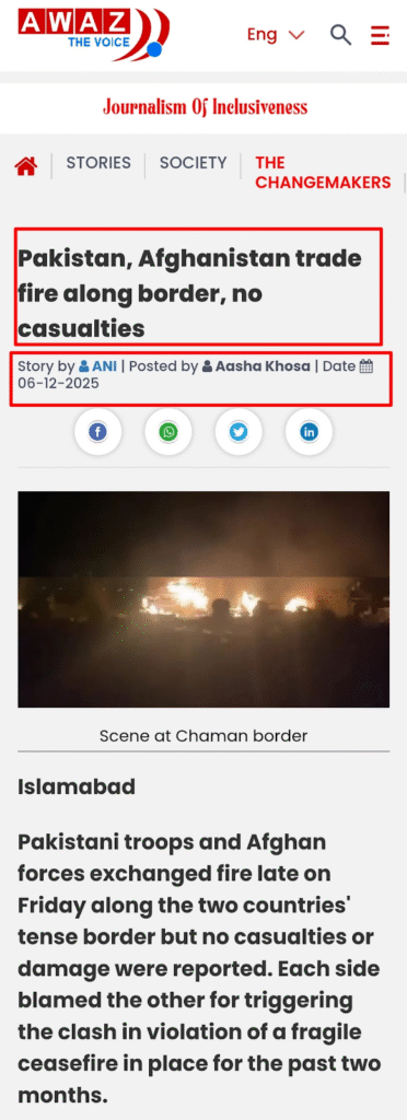 ورته انځور د ۲۰۲۵ کال د دسمبر په ۶ مه د آواز نیوز ویب پاڼې لخوا په یوه خبر مقاله کې خپور شو کله چې پاکستاني سرتیرو او افغان ځواکونو د دواړو هیوادونو د کړکیچن پولې په اوږدو کې ناوخته ډزې وکړې.