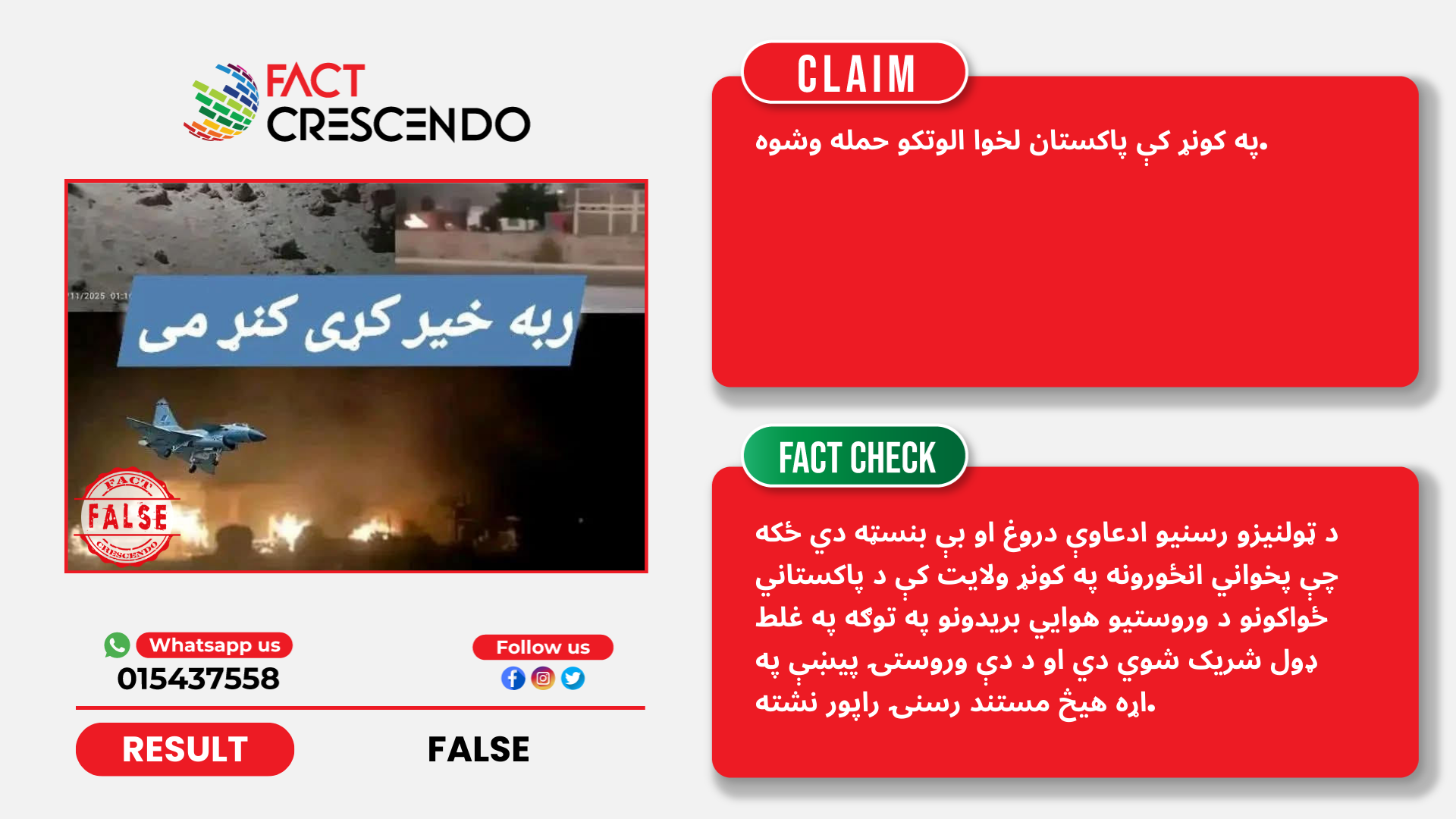 په هرصورت، د فیکټ کریسینډو موندنې ښیي چې د ټولنیزو رسنیو ادعاوې دروغ او بې بنسټه دي ځکه چې پخواني انځورونه په کونړ ولایت کې د پاکستاني ځواکونو د وروستیو هوایي بریدونو په توګه په غلط ډول شریک شوي دي او د دې وروستۍ پیښې په اړه هیڅ مستند رسنۍ راپور نشته.