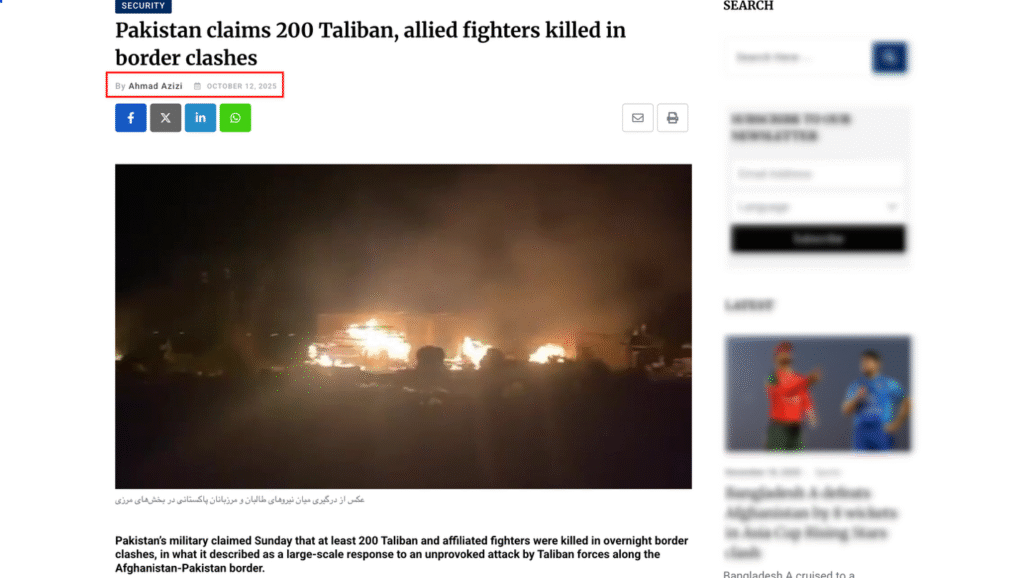 امو ټلوېزیون همدا انځور د تېرې اکتوبر میاشتې په ۱۲مه یو راپور سره خپور کړی او په عنوان کې یې ورسره لیکلي: پاکستان ادعا کوي چې ۲۰۰ طالبان او د هغوی متحد جنګیالي د سرحدي نښتو په ترڅ کې وژل شوي دي.