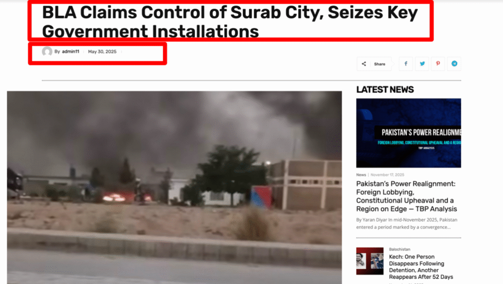 دوهم انځور هم موږ په thebalochistanpost ویبپاڼه کې پیدا کړل، چې د ۲۰۲۵ کال می میاشت کې یې خپور کړی او په عنوان کې یې ورسره لیکلي دي: د بلوچ لبریشن آرمی (BLA) د سوراب ښار کنټرول ادعا کوي.