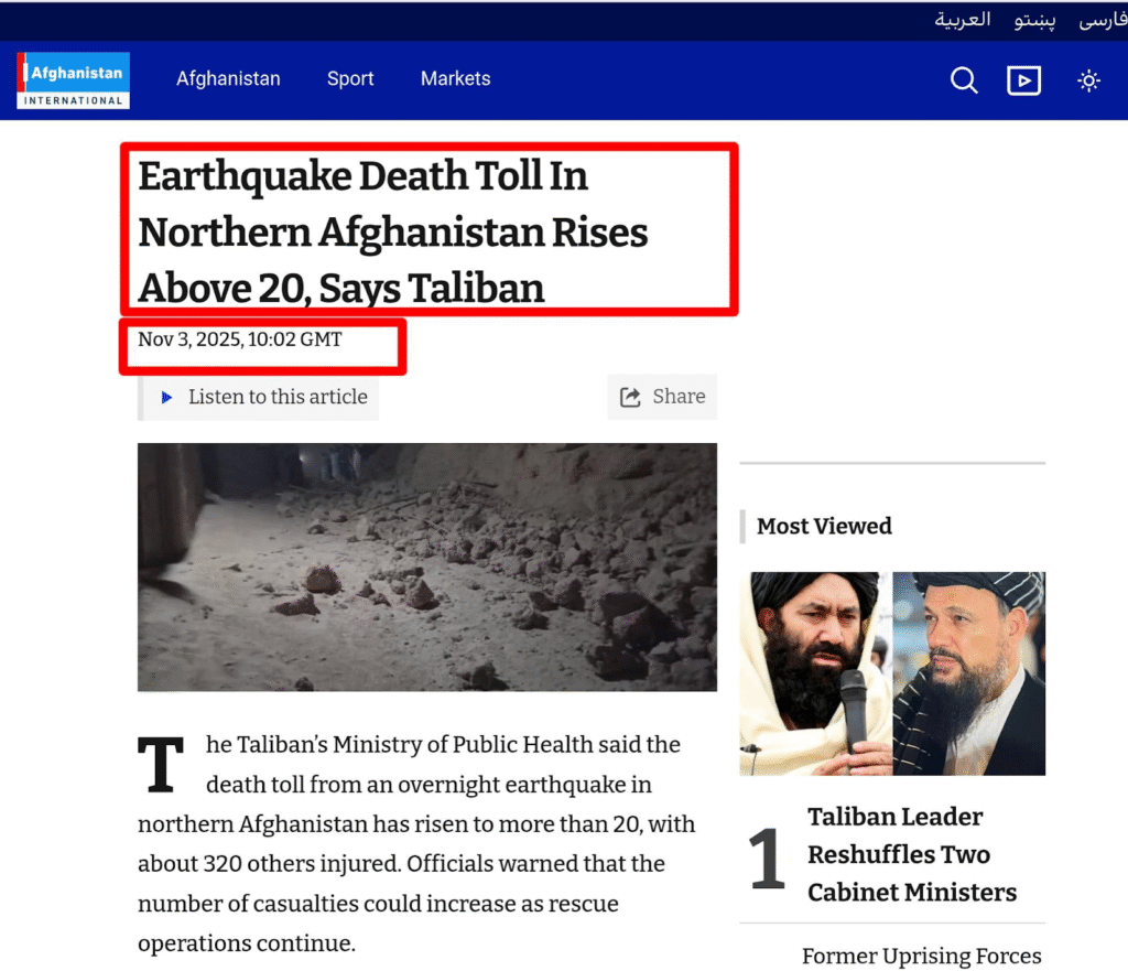 د شریک شویو انځورونو تر شا د حقیقت موندلو لپاره، موږ په لومړي انځور کې د ګوګل ریورس انځور لټون تطبیق کړ او وموندله چې دا انځور د ځینو خبري ویب پاڼو لخوا د ۲۰۲۵ کال د نومبر په ۳ مه شریک شوی و او د خپرو شویو مقالو له مخې، دا انځور د ۲۰۲۵ کال د نومبر په ۳ مه په افغانستان کې د زلزلې وروسته اخیستل شوی و.