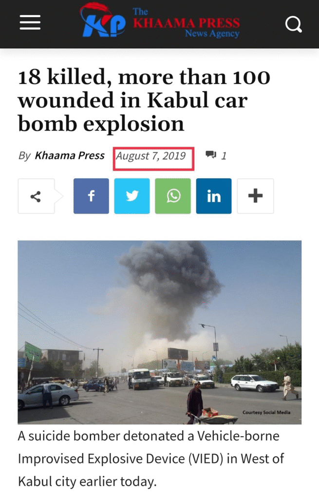 په لومړي انځور کې د ګوګل ریورس انځور لټون په کارولو سره موږ وموندله چې ورته عکس د ۲۰۱۹ په اګست کې د kamapress.com لخوا شریک شوی و او د خپرې شوې مقالې له مخې دا عکس د ښار په کوټه سنګي سیمه کې د یوې چاودنې پورې اړه لري.