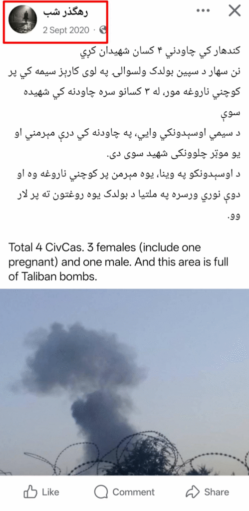 د ۲۰۲۰م کال د سپتمبر په ۲مه نېټه په فيسبوک شریک شوي پوست کې ليکل شوي “کندهار کي چاودني ۴ کسان شهیدان کړي