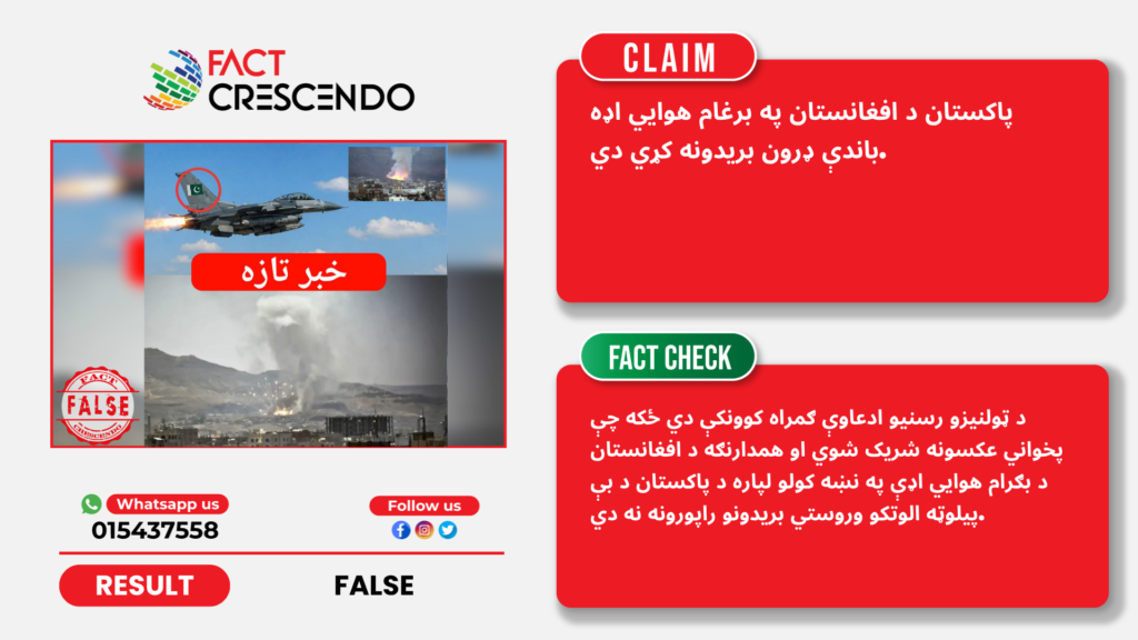 په هرصورت، د فیکټ کریسینډو موندنې ښیي چې د ټولنیزو رسنیو ادعاوې ګمراه کوونکې دي ځکه چې پخواني عکسونه شریک شوي او همدارنګه د افغانستان د بګرام هوايي اډې په نښه کولو لپاره د پاکستان د بې پیلوټه الوتکو وروستي بريدونو راپورونه نه دي.