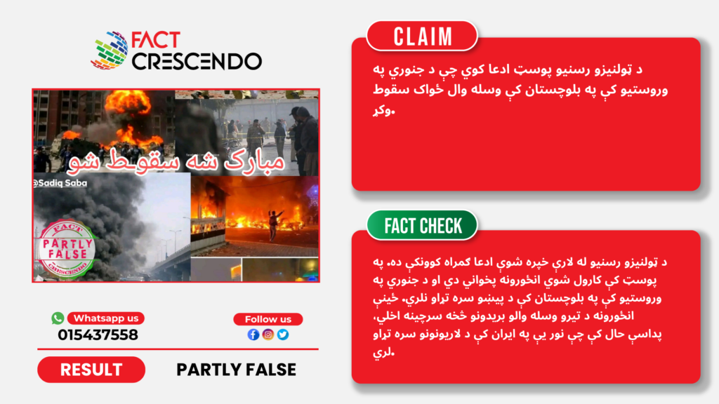 په هرصورت، د فیکټ کریسینډو موندنې ښیي چې د ټولنیزو رسنیو له لارې خپره شوې ادعا ګمراه کوونکې ده. په پوسټ کې کارول شوي انځورونه پخواني دي او د جنوري په وروستیو کې په بلوچستان کې د پیښو سره تړاو نلري. ځینې انځورونه د تیرو وسله والو بریدونو څخه سرچینه اخلي، پداسې حال کې چې نور یې په ایران کې د لاریونونو سره تړاو لري. د دې ادعا ملاتړ کولو لپاره هیڅ معتبر شواهد شتون نلري چې د راپور شوي مودې په جریان کې کوم “لشکر” یا اردو سقوط کړی وي.