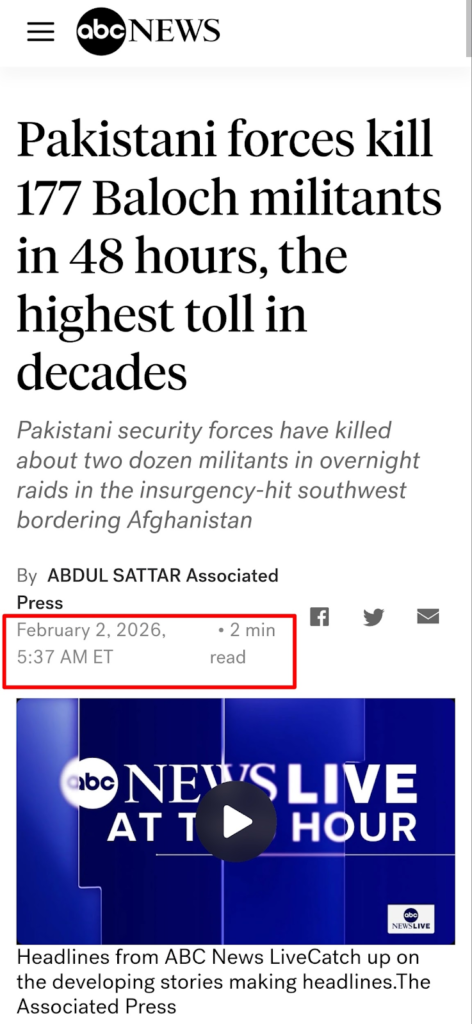 د معتبرو نړیوالو خبري رسنیو وروستي راپورونه په بلوچستان کې د وسله والو فعالیتونو زیاتوالی تاییدوي، په شمول د بیلتون غوښتونکو جنګیالیو لخوا همغږي شوي بریدونه چې امنیتي ځواکونه، زیربناوې او ملکي وګړي په نښه کوي. د پاکستان امنیتي ځواکونو په پراخه کچه د ځوابي عملیاتو سره ځواب ورکړی، د راپورونو له مخې د دې ولایت په ډیرو ولسوالیو کې په نښتو کې لسګونه وسله وال وژلي دي. د مثال په توګه، د امنیتي ځواکونو راپور ورکړل شوی چې په بلوچستان کې د ۴۸ ساعتونو په کمپاین کې د بریدونو له یوې څپې وروسته چې ملکي وګړي او امنیتي پرسونل یې هم ووژل، تر ۱۷۷ پورې وسله وال وژلي دي.