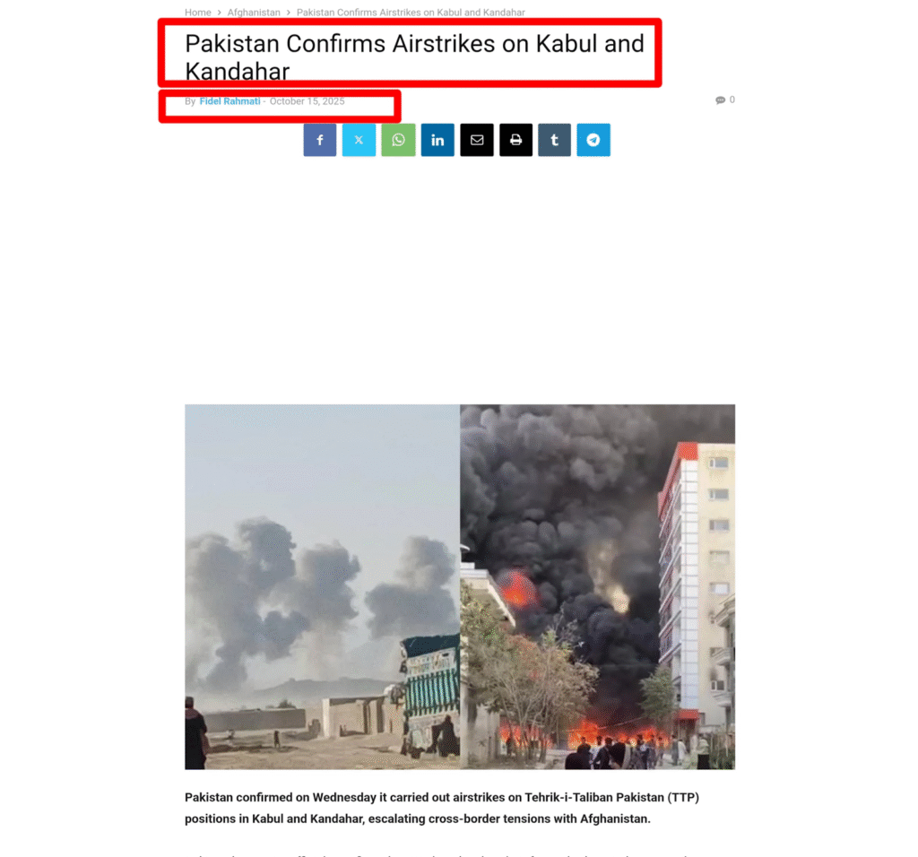 د خامه پریس لخوا د ۲۰۲۵ کال د اکتوبر په ۱۵مه خپره شوې مقاله کې ویل شوي چې دا انځورونه د افغانستان په کابل او کندهار کې د پاکستان د هوايي بریدونو وروسته اخیستل شوي دي.