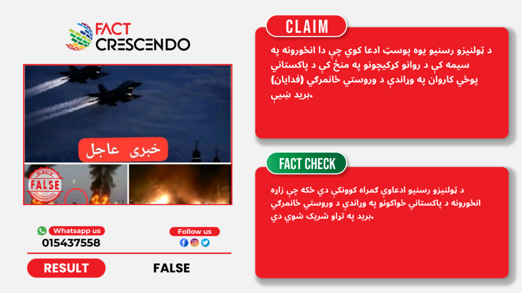 په ټولنیزو رسنیو کې یوه ادعا خپره شوې چې د دوو عکسونو سره یوځای ادعا کوي چې په دې وروستیو کې د پاکستاني پوځي کاروان په وړاندې ځانمرګی برید شوی دی. دا مهمه ده چې په یاد ولرئ چې د ۲۰۲۶ کال د فبروري په ۲۱مه، د رسمي راپورونو له مخې، د خیبر پښتونخوا په بنو ولسوالۍ کې د امنیتي ځواکونو یو کاروان په نښه شو، چې دوه سرتیري یې ووژل. په هرصورت، ویروس شوی عکس باید تایید شي ترڅو معلومه شي چې ایا دا د دې پیښې سره تړاو لري یا د یوې زړې پیښې څخه اخیستل شوی.