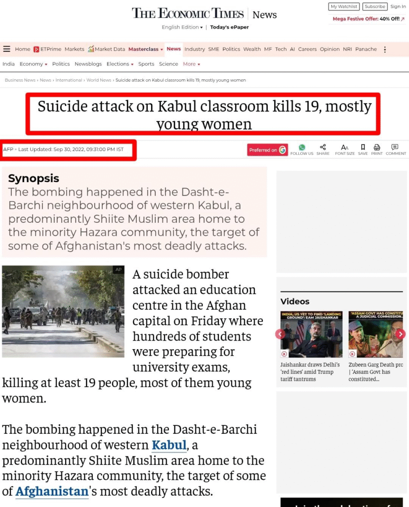 د ټایمز ناو لخوا د خپرې شوې یوې خبرپاڼې له مخې، دا انځور د ۲۰۲۲ کال په سپتمبر کې د کابل په لویدیځ کې د دشت برچي په ګاونډ کې د بمي چاودنې وروسته اخیستل شوی، چې په عمده توګه شیعه مسلمانان پکې میشت دي او د اقلیت هزاره ټولنې کور دی.