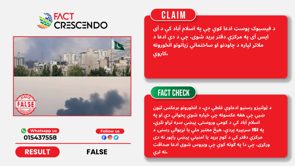 د فیسبوک یوه ویروسي پوسټ ادعا کوي چې په اسلام آباد کې د آی ایس آی په مرکزي دفتر برید شوی، چې د دې ادعا د ملاتړ لپاره د چاودنو او ساختماني زیانونو انځورونه کاروي.