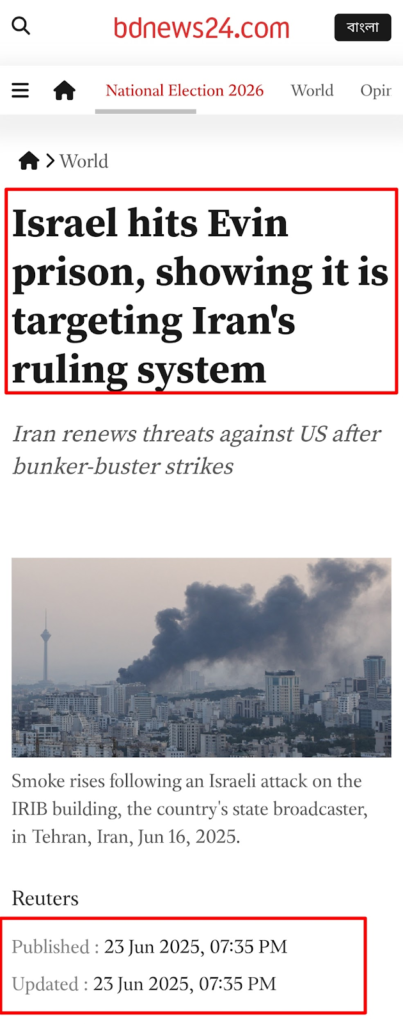 د دوهم انځور په اړه چې په ویروسي پوسټ کې شریک شوی، د عکس العمل لټون ښیي چې دا د bdnews24.com په یوه مقاله کې ښکاري چې سرلیک یې دی “اسرائیل د ایون زندان وهي، دا ښیي چې دا د ایران واکمن سیسټم په نښه کوي،” ۲۰۲۵م کال د جون په ۲۳مه خپور شو. اصلي انځور، چې رویټرز ته اعتبار ورکړل شوی، د ایران-اسرائیل شخړې په جریان کې د ایران په تهران کې د ایران د اسلامي جمهوریت د نشراتو (IRIB) ودانۍ باندې د اسراییلو د برید وروسته اخيستل شو. دا انځور په پاکستان یا اسلام آباد کې د کومې پیښې سره تړاو نلري، دا تاییدوي چې دا په ټولنیزو رسنیو ادعا کې غلط منسوب شوی دی.