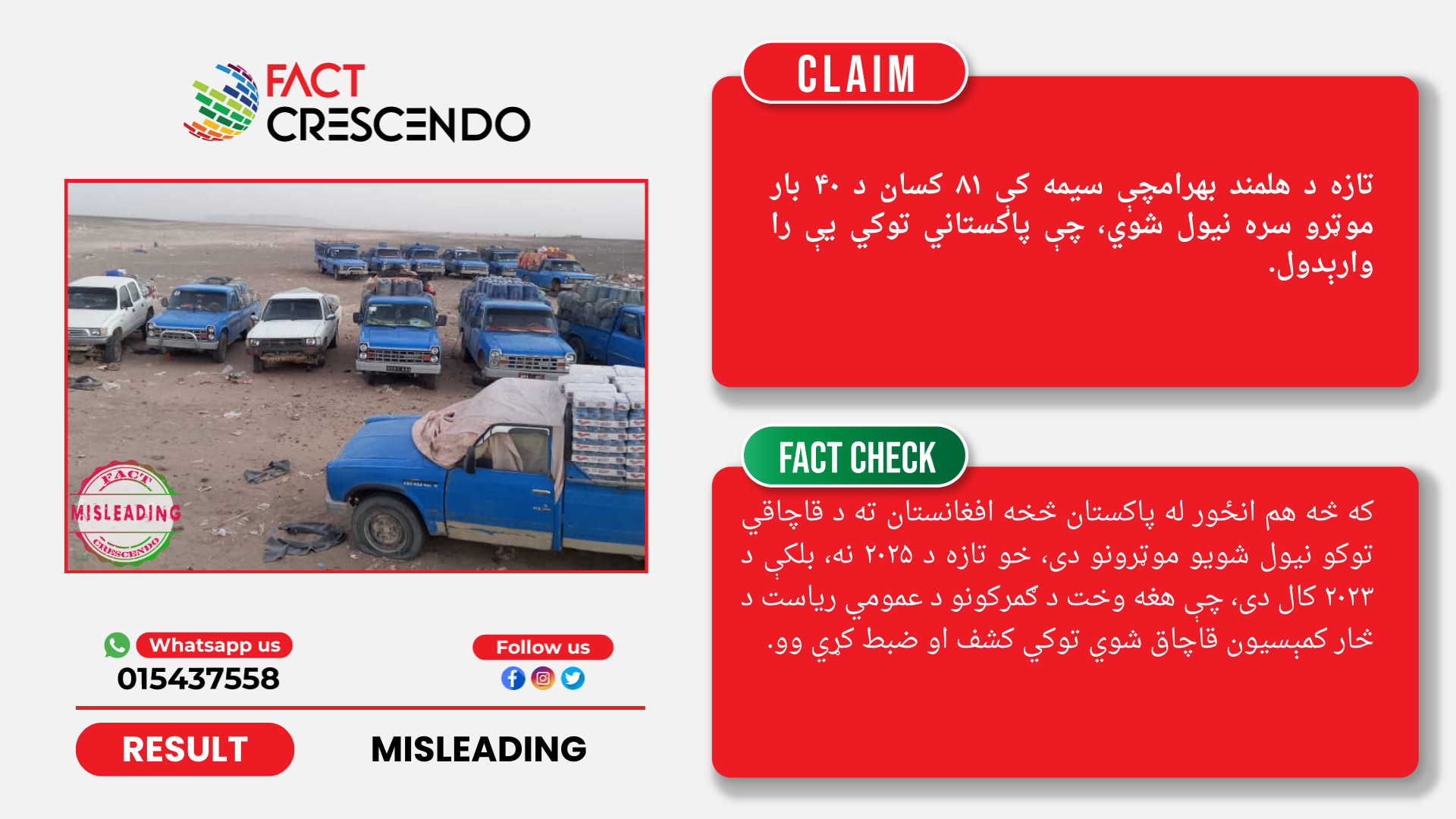 د ۲۰۲۵ کال نومبر میاشتې په ۱۶مه نېټه د ټولنیزو رسنیو فیسبوک ګڼ شمېر کاروونکو په پاکستان څخه د نېول شویو قاچاقي توکو بار موټرونو یو انځور له دې ادعا سره خپور کړی دی، چې ګواکې دا تازه د هلمند په بهرامچه سیمه کې ۴۰ هغه نېول شوي ډک موټرونه دي، چې له پاکستان څخه یې افغانستان ته توکي را وارېدول او ونیول شول. خو د فکټ کریسنډو موندنې ښیي، چې خپور شوی انځور پخوانی دی.