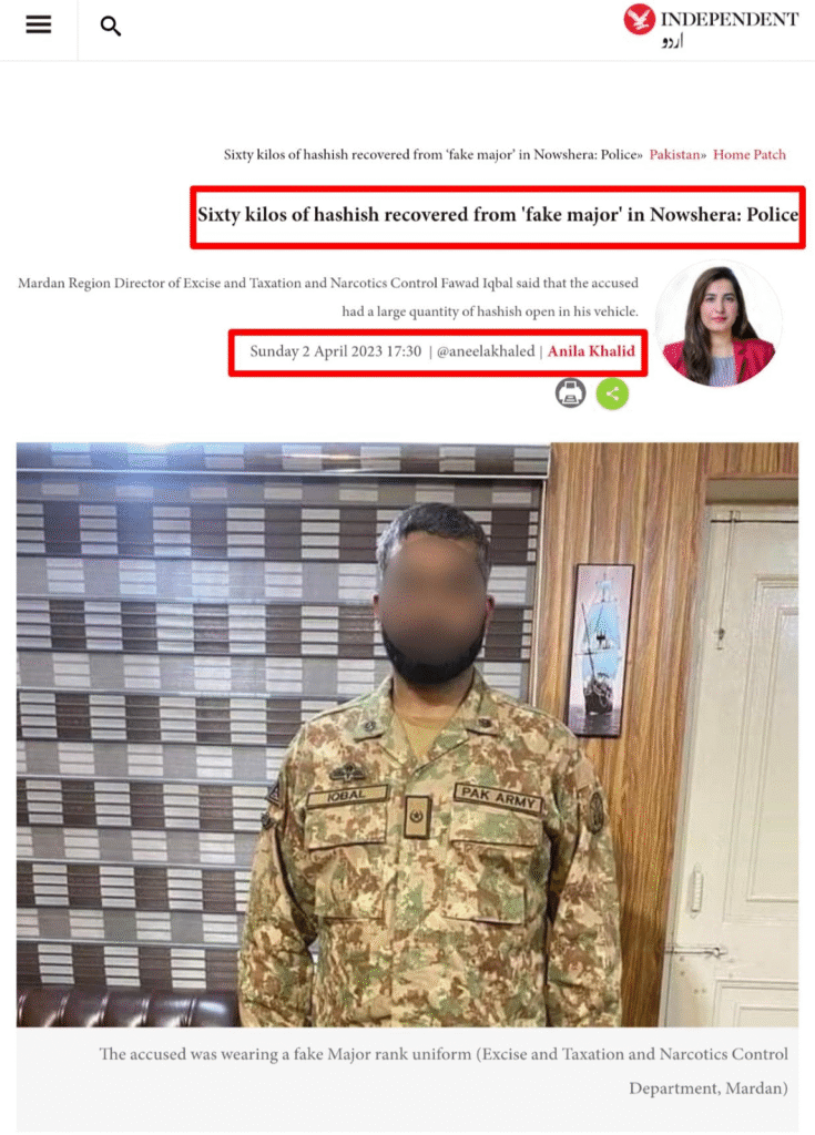 په هرصورت، د فیکټ کریسینډو موندنې ښیي چې د ټولنیزو رسنیو ادعا دروغ او بې بنسټه ده ځکه چې دا د ۲۰۲۳ کال د اپریل یوه پخوانۍ ویډیو ده، کله چې یو ملکي وګړی په مردان کې د اکسائز پولیسو لخوا د جعلي پوځي یونیفورم اغوستی و او د ۶۰ کیلو ګرامه چرسو د قاچاق کولو هڅه یې کوله ونیول شو. دا ویډیو د خیبر پښتونخوا پولیسو لخوا د پاکستاني پوځ د میجر د نیول کیدو وروستۍ پیښه نه ښیې.