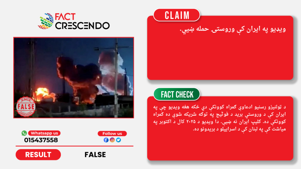 په هرصورت، د فیکټ کریسینډو موندنې ښیي چې هغه ویډیو چې په ایران کې د وروستي برید په توګه شریکه شوې ده ګمراه کوونکې ده. دا ویډیو پخوانۍ ده او په حقیقت کې له لبنان څخه سرچینه اخلي، چیرې چې د اسراییلو د هوایی بریدونو په جریان کې ورته ویډیوګانې مخکې ثبت شوې وې. همدا ویډیو اوس په ټولنیزو رسنیو کې د ایران په اړه د امریکا د وروستي برید په اړه د غلط ادعا سره بیا خپریږي.