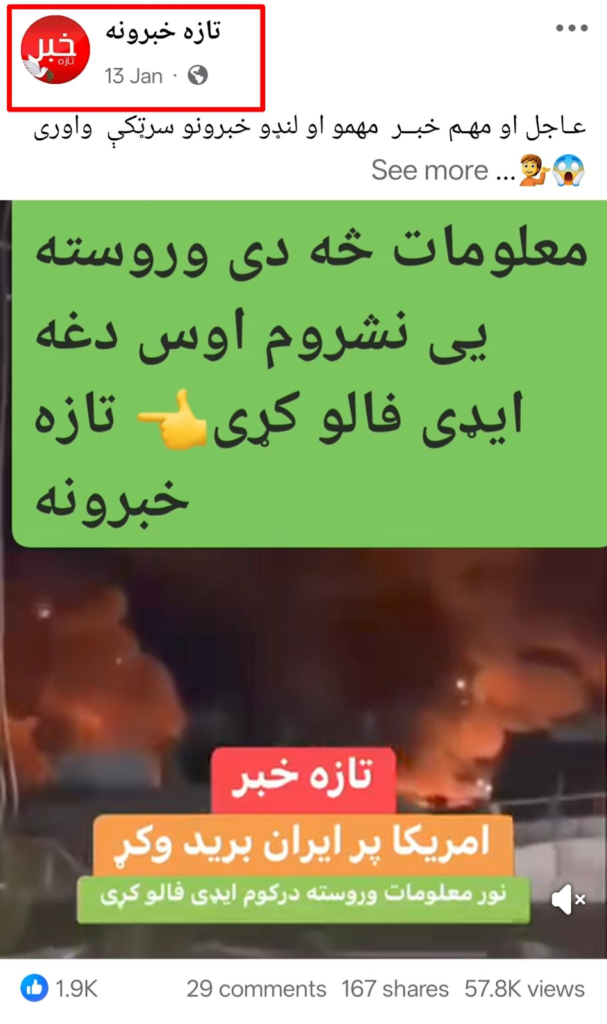 د ۲۰۲۶ کال په جنوري کې، یوه ویډیو په پراخه کچه آنلاین شریکه شوه چې ادعا یې کوله چې متحده ایالات په ایران برید کوي. دا ادعا غلطه او ګمراه کوونکې ده. دا ویډیو په حقیقت کې د اسراییلو د پخوانیو پوځي عملیاتو سره مطابقت لري، چې په کې د اسراییلو هوايي ځواک د ۲۰۲۵ کال په اکتوبر کې د لبنان په سویلي او ختیځ سیمو کې څو هوايي بریدونه ترسره کړل.