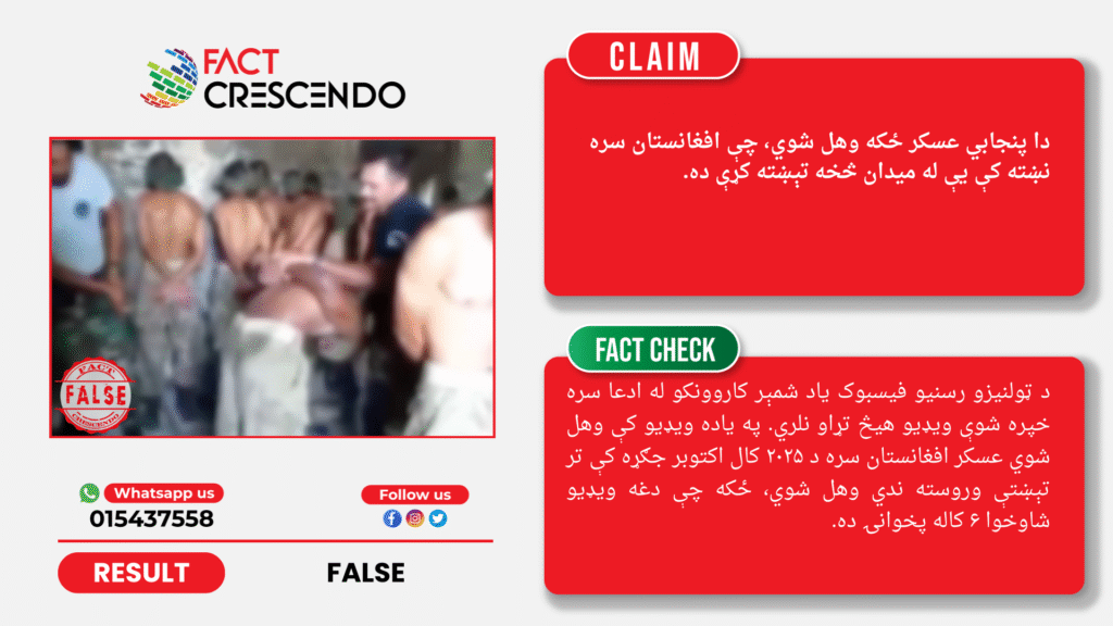د ۲۰۲۵ کال تېرې اکتوبر میاشت کله، چې د افغانستان او پاکستان ترمنځ په ډیورنډ فرضي کرښه امنیتي وضیعت کړکېچن وو، نو په دې لړ کې د همدې کال اکتوبر میاشتې په ۱۶مه نېټه د ټولنیزو رسنیو فیسبوک یو شمېر کاروونکو یوه ویډیو خپره کړې، چې پکې ښکاري پاکستاني پوځیان خپل غړي په سخت شکل سره وهي. د ټولنیزو رسنیو فیسبوک یاد شمېر کاروونکو د دې ویډیو په خپرولو سره ادعا کړې، چې ګواکې دا هغه پنجابي عسکر دي، چې له افغانستان سره په جګړه کې له میدان څخه تښتېدلي دي او بیا خپلو افسرانو د جزا په توګه وهل ورکړي دي. خو د فکټ کریسنډو موندنې ښیي، چې خپره شوې ویډیو له شوې ادعا سره هیڅ تړاو نلري او پخوانۍ هم ده.