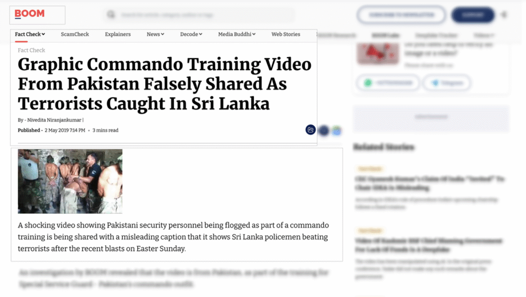 همدا راز موږ وموندل، چې همدا ویډیو پخوا هم له ناسمو ادعا سره خپره شوې ده او ۲۰۱۹ کال کې پرې څېړنې شوي دي. د بوم په نوم یو ویبسایت همدا ویډیو فکټ چیک کړې ده او ورسره یې لیکلي دي: د پاکستان څخه د کمانډو د روزنې ګرافیک ویډیو په سریلانکا کې د نیول شویو ترهګرو په توګه په غلط ډول شریکه شوې ده.