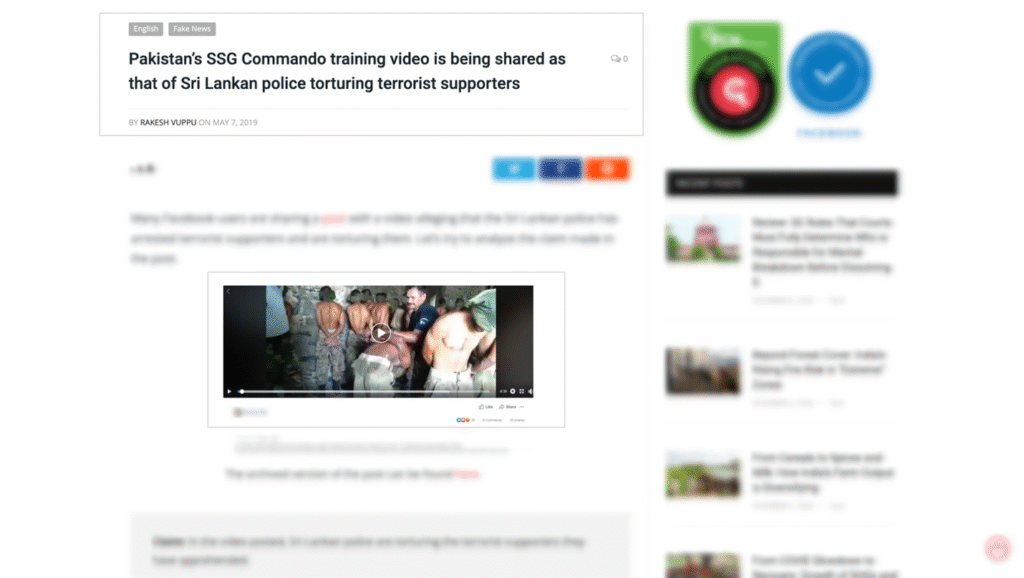 د دې سربېره تاسې یو بل فکټ چیک هم په دې لینک کې لوستلی شئ، چې د یادې ویډیو په تړاو خپور شوی دی. فاکټلي لیکلي، د پاکستان د ایس ایس جي کمانډو د روزنې ویډیو د سریلانکا د پولیسو د ترهګرو ملاتړ کونکو د شکنجه کولو په توګه شریکه شوې ده.