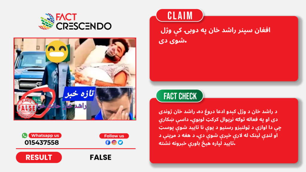 په دوبۍ کې د راشد خان د مړینې په اړه د ټولنیزو رسنیو د ادعاوو تر شا د حقیقت موندلو لپاره، موږ لومړی د تایید شویو راپورونو لټون وکړ ترڅو د ادعاوو اعتبار ومومو، په هرصورت، د ادعاوو د تایید لپاره هیڅ مستند رسنۍ راپورونه شتون نلري.
