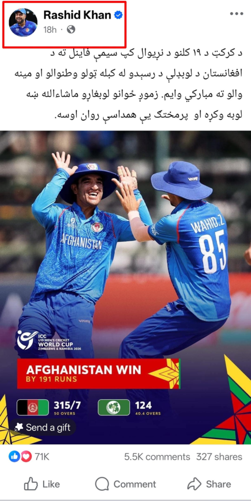 “د کرکټ د ۱۹ کلنو د نړیوال کپ سیمې فاینل ته د افغانستان د لوبډلې د رسېدو له کبله ټولو وطنوالو او مینه والو ته مبارکي وایم. زموږ ځوانو لوبغاړو ماشاءالله ښه لوبه وکړه او پرمختګ یې همداسې روان اوسه.”