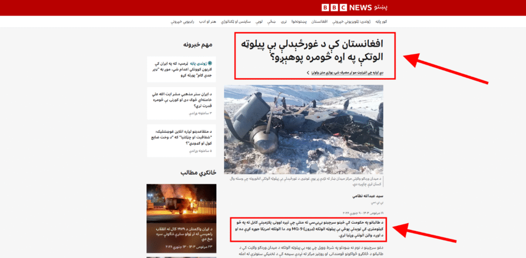 بي بي سي پښتو په میدان وردګو ولایت کې د دې پېښې په اړه تر «افغانستان کې د غورځېدلې بې پیلوټه الوتکې په اړه څومره پوهېږو؟» تر عنوان لاندې یو بشپړ راپور خپور کړی دی. هلته داسې څه ندي لیکل شوي، وویل شي دغه الوتکه د کوم چا لخوا نسکوره شوې ده، بلکې د راپور په لومړي پاراګراف کې لیکل شوي دي: «د طالبانو په حکومت کې ځینو سرچینو بيبيسي ته منلې چې تېره اوونۍ پلازمېنې کابل ته په څو کیلومترۍ کې لوېدلې پوځي بې پیلوټه الوتکه (ډرون) MQ-9 وه.»