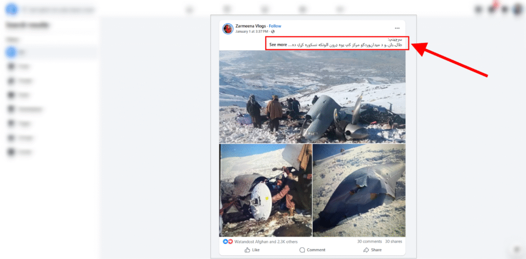 لومړی تاسې کولی شئ د ټولنیزو رسنیو فیسبوک کاروونکو لاندې څو پوسټونه د نمونې په توګه وګورئ. دوی له خپور شوي انځور سره خپلو پوسټونو کې لیکلي دي: «طالبانو میدان وردګو مرکز کې یوه ډرون الوتکه را نسکوره کړې ده».