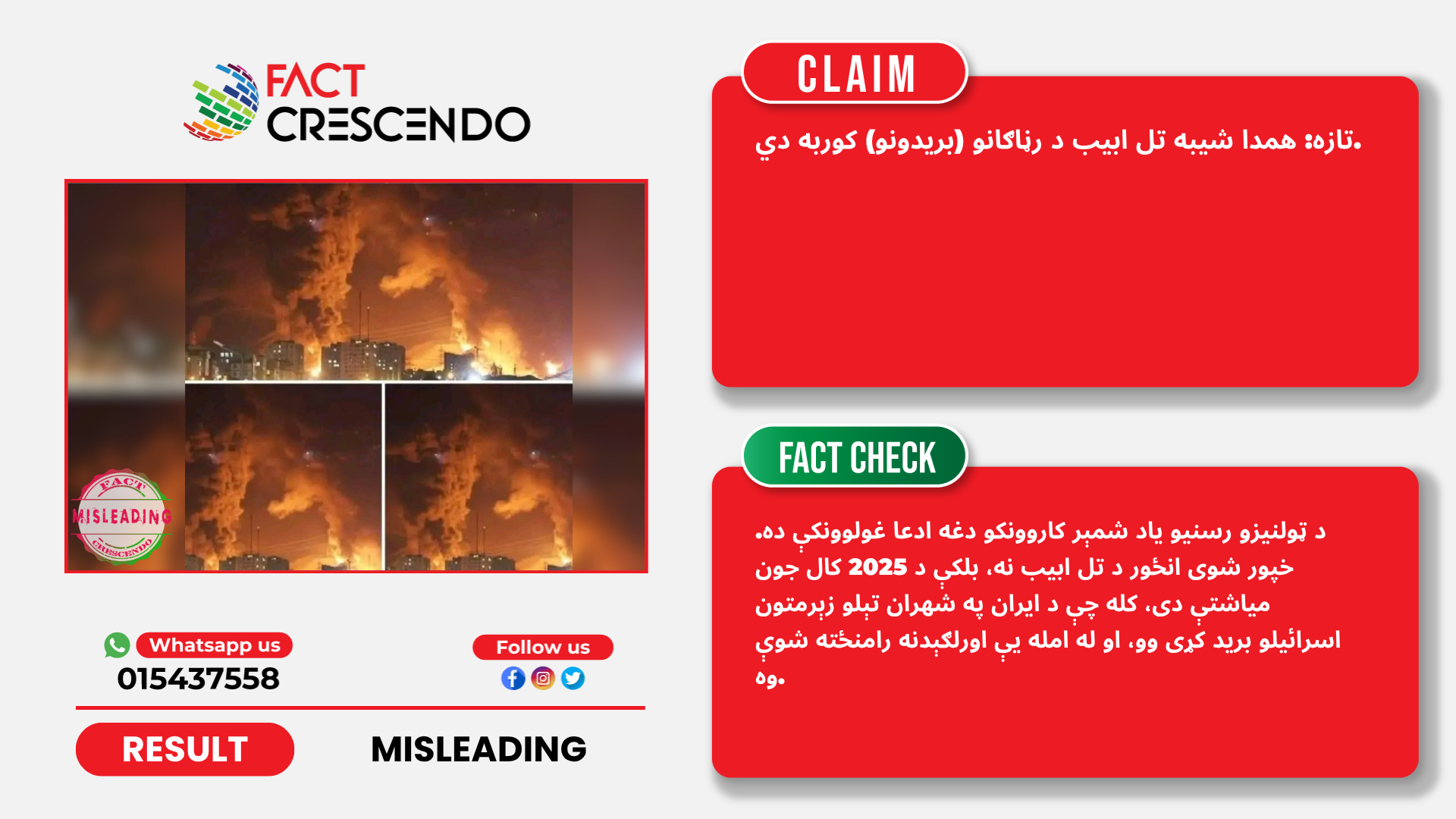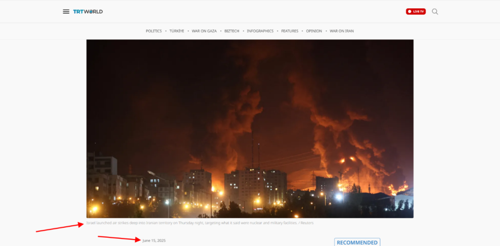 د ټولنیزو رسنیو یاد شمېر کاروونکو دغه ادعا غولوونکې ده. خپور شوی انځور د تل ابیب نه، بلکې د 2025 کال جون میاشتې دی، کله چې د ایران په شهران تېلو زېرمتون اسرائیلو برید کړی وو، او له امله یې اورلګېدنه رامنځته شوې وه.