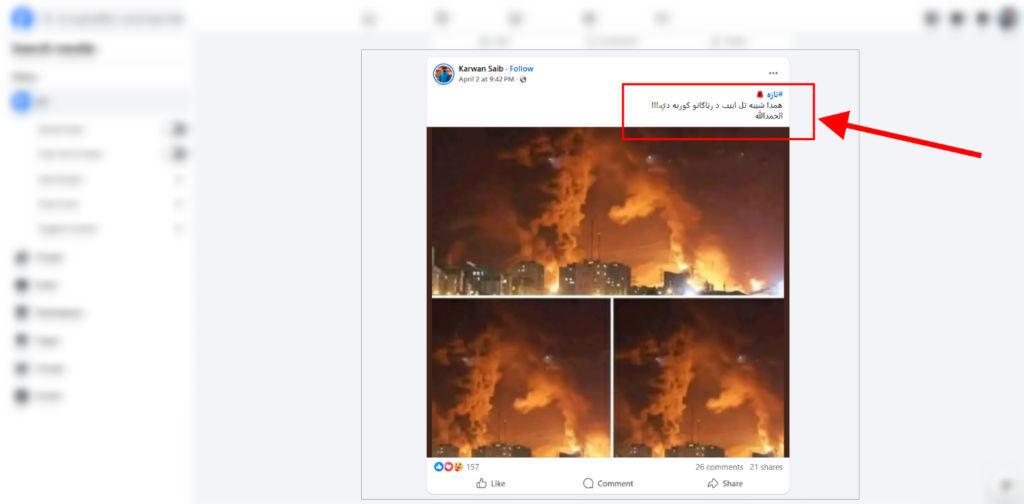 پر ایران د امریکا-اسراییلو د جګړې په جریان کې د 2026 کال اپرېل په دویمه د ټولنیزو رسنیو ګڼ شمېر فیسبوک کاروونکو یو انځور له دې ادعا سره خپور کړي، چې ګواکې دا د اسراییلو په تل ابیب کې د اور لګېدنې تازه رڼا ګانې دي، چې د بریدونو له امله رامنځته شوي دي. خو د دغې ادعا په اړه د فکټ کریسنډو موندنې ښیي، چې د ټولنیزو رسنیو یاد شمېر کاروونکو دغه ادعا ناسمه ده او وایرل شوی انځور د 2025 کال دی او د تل ابیب کوم ځای نه، بلکې د تهران دی.