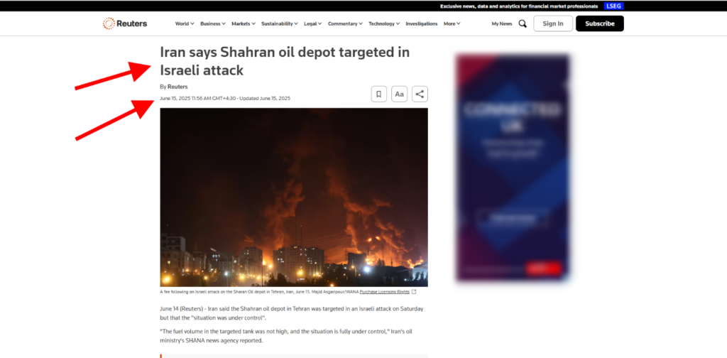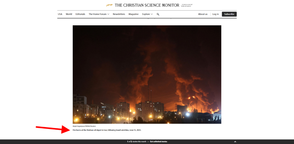 د Reuters خبري ایجنسي په یو راپور (2025) کې همدا انځور له خپل ادسه خپور کړی دی او ورسره یې په کپشن کې لیکلي دي: د جون په ۱۵مه، د ایران د تهران ښار کې د شهران د تېلو په زېرمتون د اسرائیلي برید وروسته اور ولګېد.