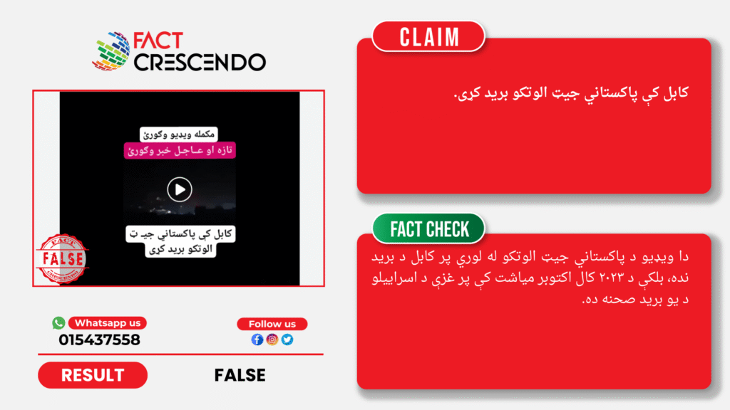 د ټولنیزو رسنیو فیسبوک ګڼ شمېر کاروونکو د تېرې اکتوبر میاشتې په ۱۰مه نېټه یوه ویډیو له دې ادعا سره خپره کړې، چې ګواکې دا پر کابل د پاکستاني جیټ الوتکو د برید صحنه ده. خو د فکټ کریسنډمو موندنې ښیي، چې د برید دغه ویډیو پر کابل د کوم برید نده، بلکې په حقیقت دا په ۲۰۲۳ کې د اسرایلو لخوا پر غزې د یو برید ویډیو ده.