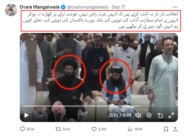 د ټولنیزو رسنیو یو فعال اویس منګل واله نومي خبریال دا ویډیو په خپله ایکس پاڼه خپره کړې او ډېر په تُنده لهجه یې ورسره لیکلي، چې د افغان کونسلګرۍ طالب دیپلوماتانو له لوري د پاکستان ملي سرود ته نه ودرېدو ټولو ډيپلوماتيکو اخلاقو ته سپکاوی شوی، چې د ده په خبره دا د ټول پاکستان سپکاوی دی…)