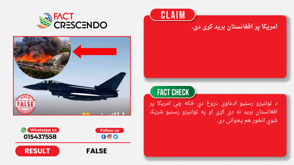 په هرصورت، د فیکټ کریسینډو موندنې ښیي چې د ټولنیزو رسنیو ادعاوې دروغ دي ځکه چې امريکا پر افغانستان بريد نه دی کړی او په ټولنیزو رسنيو شریک شوي انځور هم پخوانی دی.
