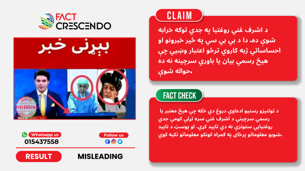 په هرصورت، د فیکټ کریسینډو موندنې ښیي چې د د ټولنیزو رسنیو ادعاوې دروغ دي ځکه چې هیڅ معتبر یا رسمي سرچینې د اشرف غني سره تړلې کومې جدي روغتیايي ستونزې نه دي تایید کړي، او پوسټ د تایید شویو معلوماتو پرځای په ګمراه کونکو معلوماتو تکیه کوي.