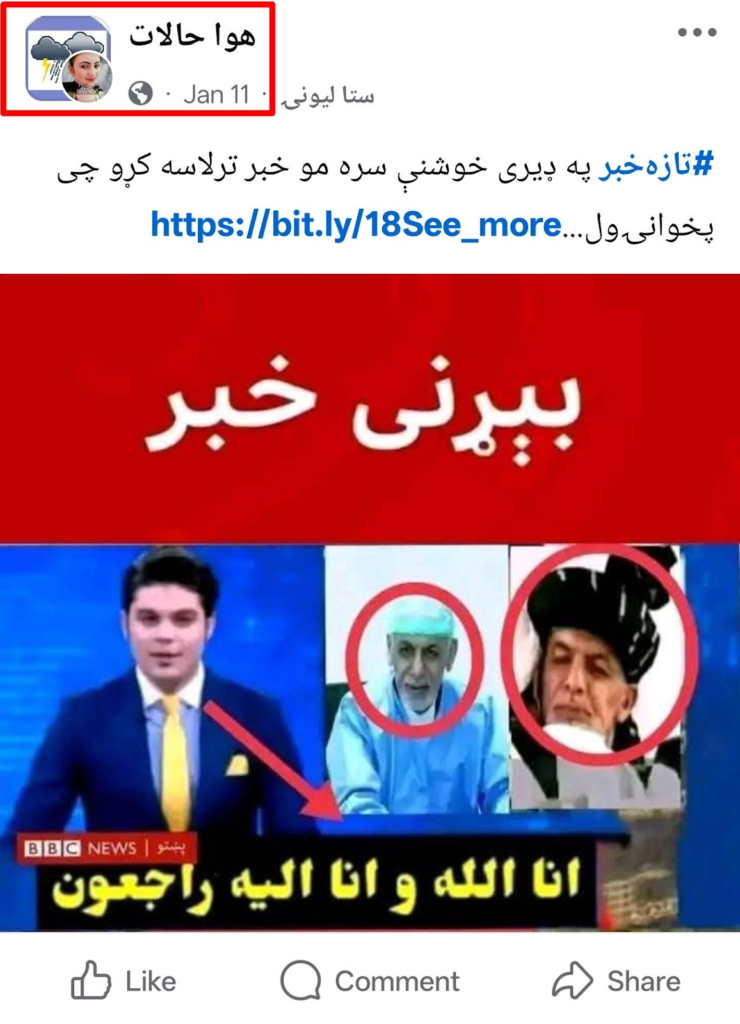 د ټولنیزو رسنیو پوسټ ادعا کوي چې د اشرف غني روغتیا په جدي توګه خرابه شوې ده. دا د بي بي سي په څیر خبرونو او احساساتي ژبه کاروي ترڅو اعتبار وښيي چې هیڅ رسمي بیان یا باوري سرچینه نه ده حواله شوې.
