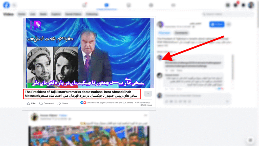 در قدم نخست، میتوانید چند پُست کاربران فیسبوک را به عنوان نمونه ببینید. آنان همراه با این ویدیو نوشتهاند: «سخن های رییس جمهور تاجیکستان در مورد قهرمان ملی احمد شاه مسعود».
