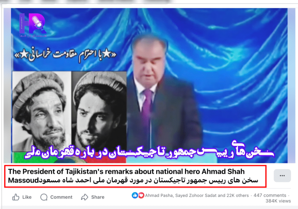 رئیسجمهور تاجیکستان، امامعلی رحمان، در یک ویدیو از مردم و کشور خود ستایش کرده است. اما شماری از کاربران فیسبوک با نشر این ویدیو ادعا کردهاند که گویا امامعلی رحمان در مورد قهرمانی و دلاوری احمد شاه مسعود صحبت کرده است.