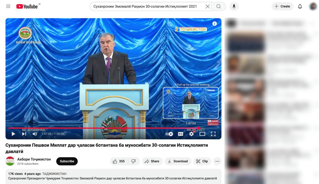 ما این ویدیو کامل را در کانال یوتیوبیای به نام خبرهای تاجکستان (Ахбори Тоҷикистон) یافتیم. در کپشن این ویدیو نوشته شده است: «سخنرانی رهبر ملت در یک مراسم با شکوه به مناسبت سیاُمین سالگرد استقلال کشور».