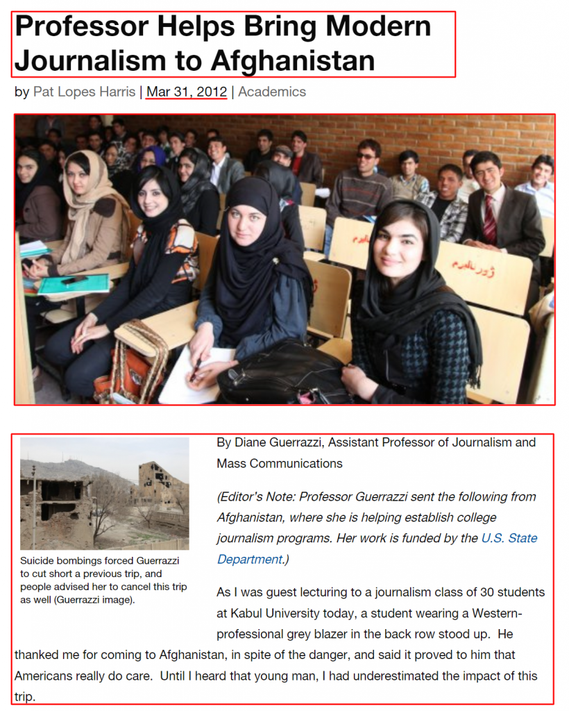وبسایت SJSU این تصویر را در ۳۱ مارچ ۲۰۱۲ میلادی منتشر کرده است. این وبسایت به نقل از دیان گورازی، استاد روزنامهنگاری و ارتباطات جمعی گفته است که یکی از دانشجویان دانشگاه کابل از وی به علت آمدنش به افغانستان تشکری کرده است. دیان گوارزی در خصوص این دانشجو گفته است که او کت خاکستری رنگ خط دار بر تنش کرده و در ردیف عقب نشسته بود.